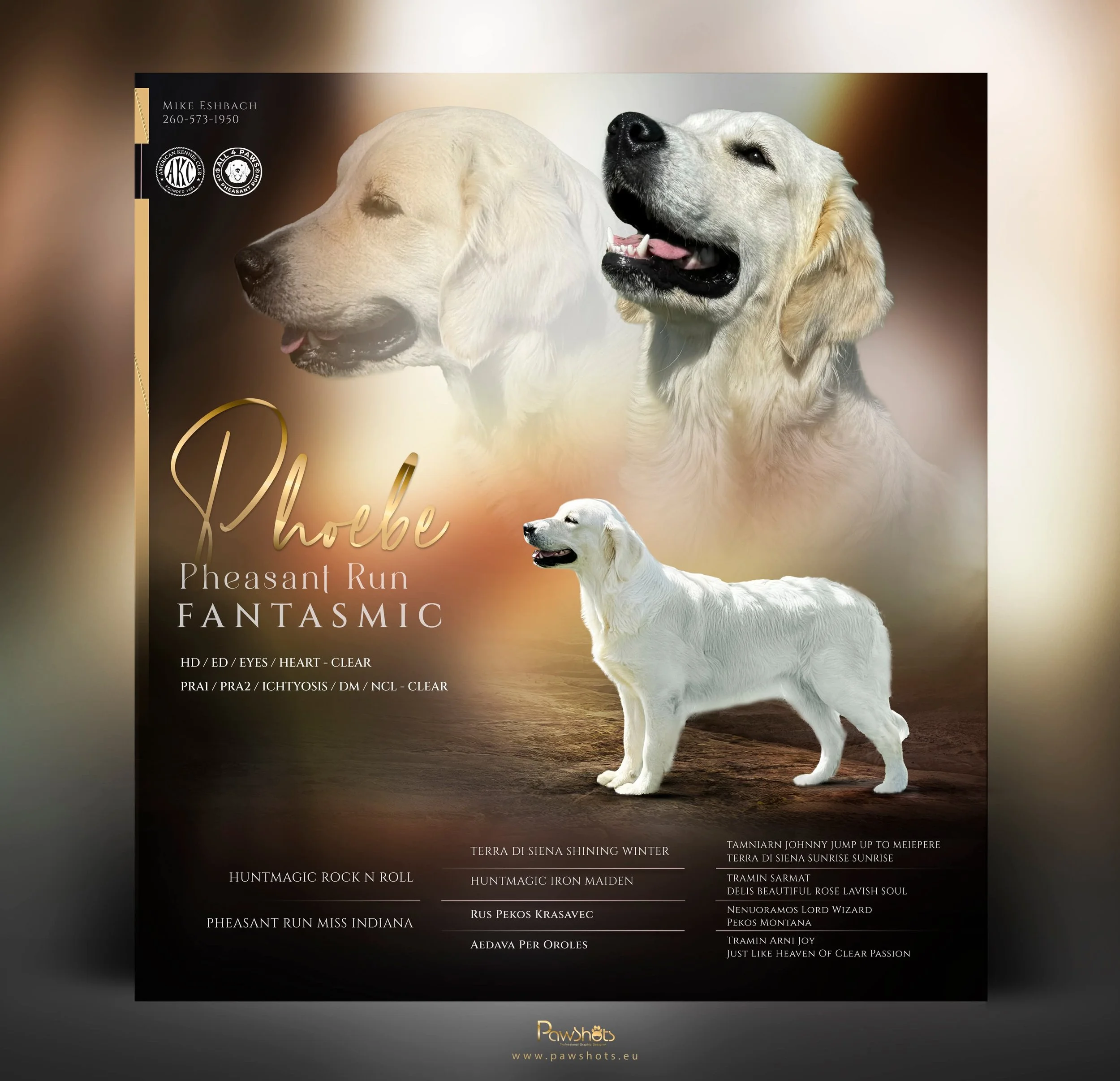 Phoebe is a third-generation girl from our breeding program and a true reflection of the dedication and hard work we have put into enhancing the Golden Retriever breed, not only within our own program but across the U.S. Her pedigree is exceptional—her great-grandfather is World Champion Tramin Arni Joy, her grandfather is Rus Pekos Krasavec, and her grandmother is our beloved matriarch, Emma, along with notable dogs such as Tramin Sarmat and Terra Di Siena Shinning Winter. Every dog in Phoebe’s three-generation pedigree is a champion, with the exception of Pheasant Run Miss Indiana.