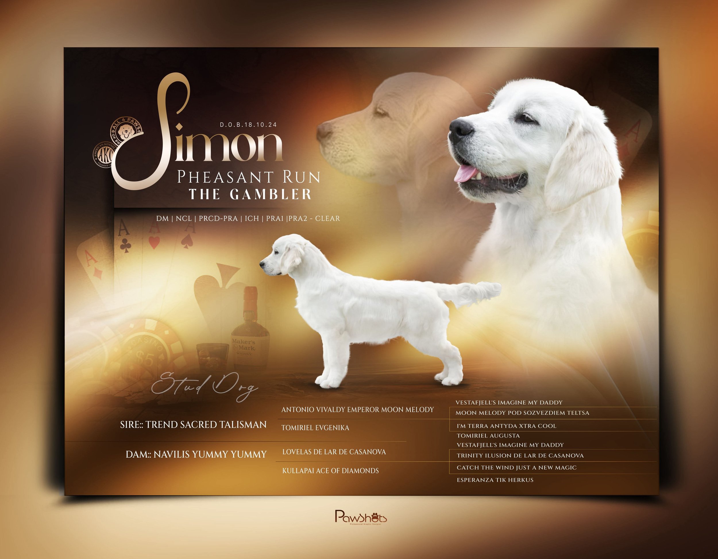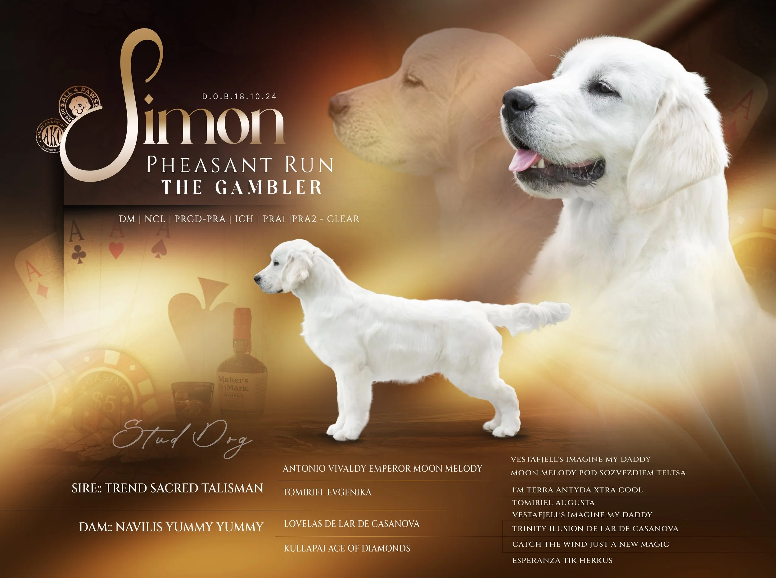 Simon’s pedigree is filled with champions in every generation and represents decades of carefully selected exceptional bloodlines. His quality is no accident, and we are incredibly grateful to have produced such a handsome boy with tremendous potential.