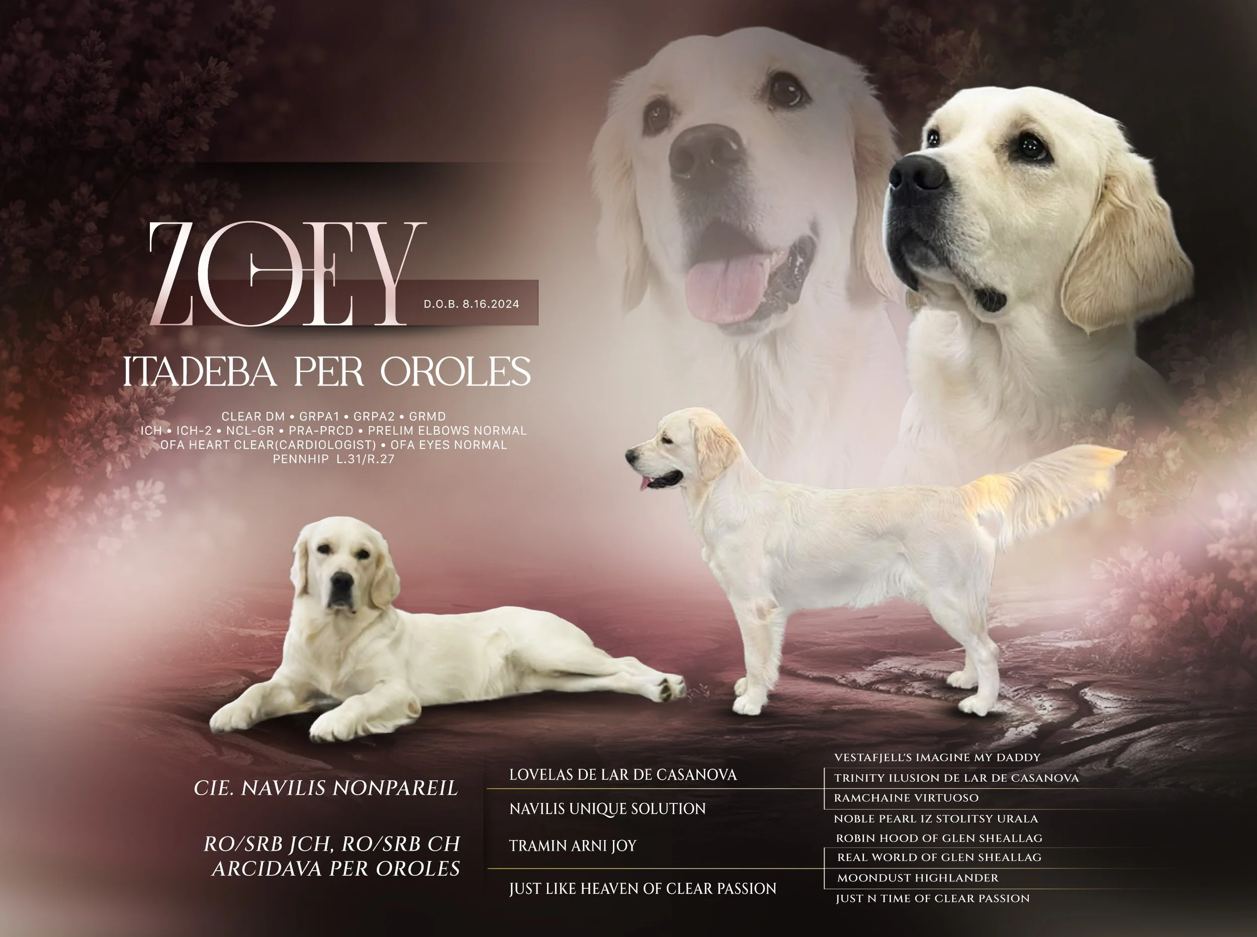Zoey has an amazing pedigree filled with champions. Zoey is a granddaughter of World Champion Tramin Arni Joy and multi champion Lovelas de Lar de Casanova. Zoey’s parents are RO/SRB CH Arcidava Per Oroles and CIE Navilis Nonpariel. Every parent, grandparent and great grandparent are champions. Zoey has the health clearances, confirmation, champion bloodlines and outstanding character to be one of the favorites of our vistors.